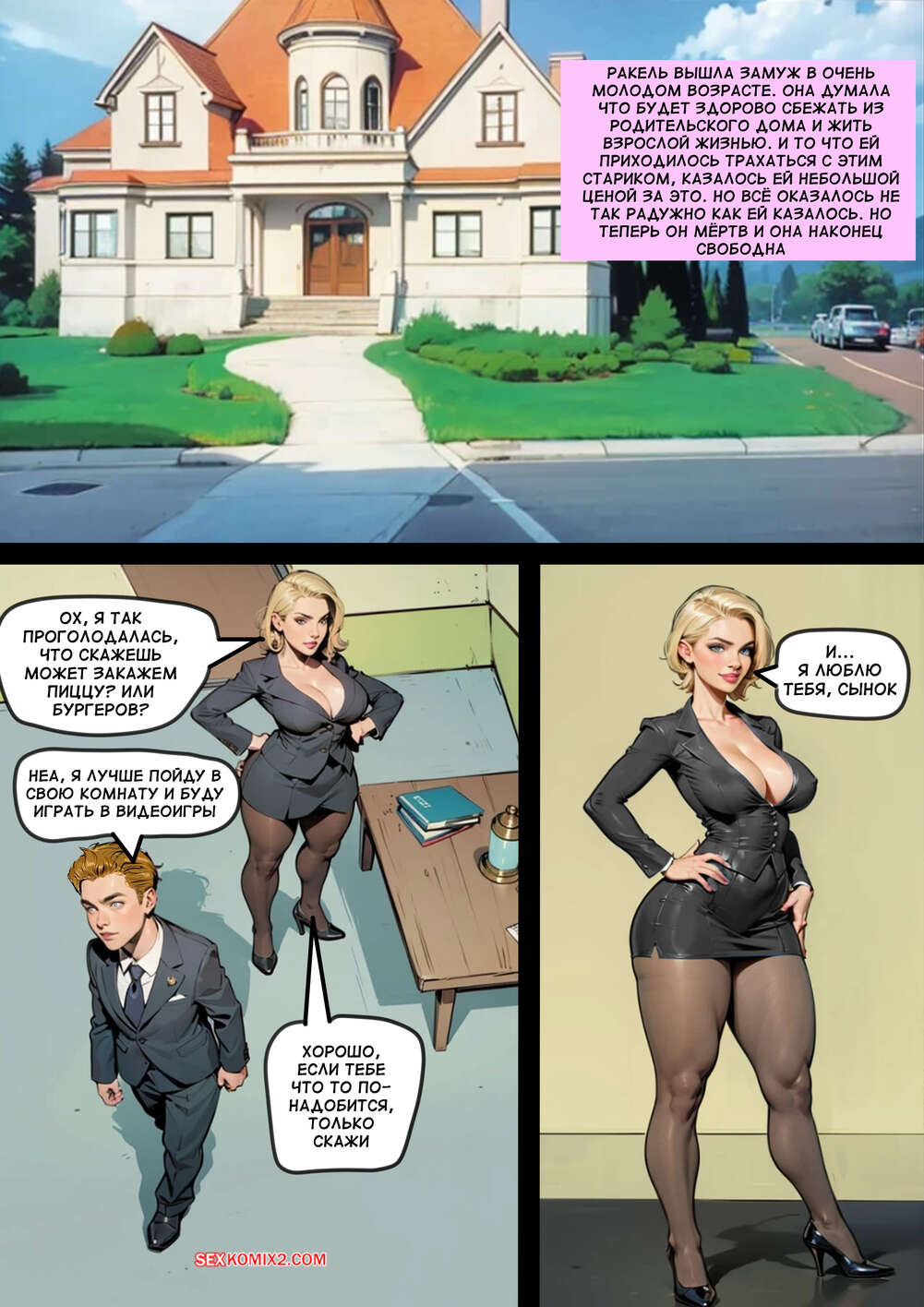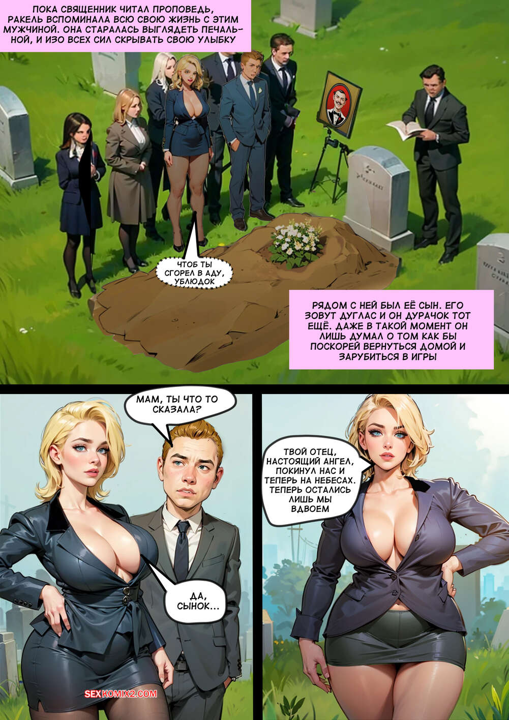 Порно комикс Счастливая вдова. The Merry Widow. mr cookie for sexkomix2.com После смерти мужа горячей милфе больше не с кем трахаться и она пользуется дилдо, чтобы себя удовлетворить, но ей этого мало. Красотка соблазняет сына шикарным телом в сексуальном белье и сосет его член, после чего дает выебать свою пизду и задницу.
